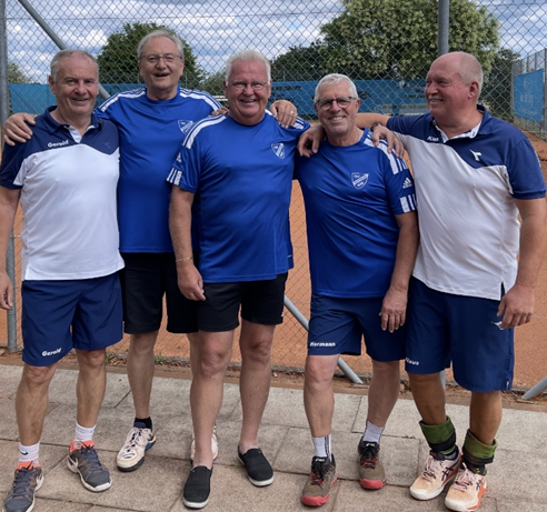 So konnte also doch auf allen Plätzen ab 14.00 Uhr gespielt werden. Wie erwartet war es ein harter Fight, nicht nur mit den Gegnern, sondern auch gegen die Hitze. Dennoch konnten alle Einzel gewonnen werden und somit auch die gesamte Begegnung. Der Zwischenstand von 4 : 0 sicherte unseren Hobby-Herren sowohl den Sieg am Spieltag, wie auch die Meisterschaft in der Liga.